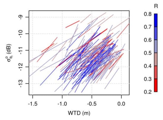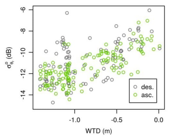 - The link between σ° and WTD becomes weaker towards the dry end of WTD. In Figure 6, the dependency seems to vanish at a WTD of approximately −1 m. We could not identify a systematic threshold WTD for all of our sites and, where present, it varied from about −0.5 to 1.5 m.