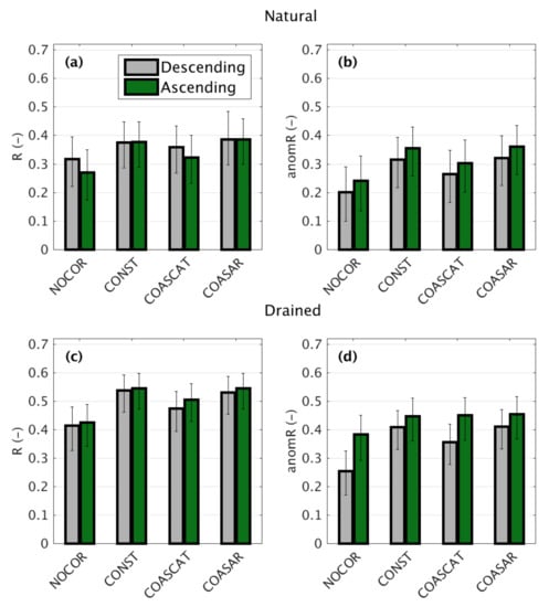 Temporal Pearson correlation coefficient and 95% confidence intervals for original (R) and anomaly time series (anomR) for the differently processed backscatter time series (NOCOR: no incidence angle correction, CONST: constant slope normalization, COASCAT: cross-over angle concept using ASCAT slope and curvature climatology, COASAR: cross-over angle concept using slope climatology derived from ASAR data). Skills are shown for (a,b) natural, and (c,d) drained sites, both for descending and ascending nodes.