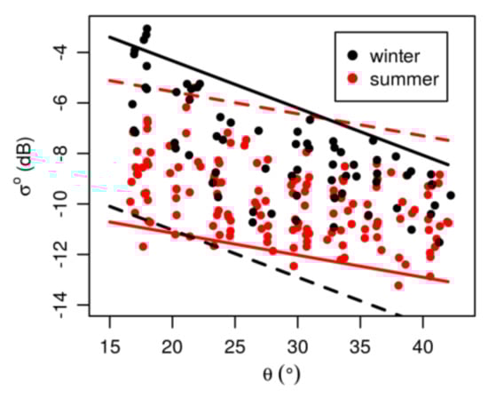 The simplest form to account for incidence angle dependency of backscatter is the linear normalization []. The curvature of the dependency is typically neglected for the moderate incidence angle range of ASAR data []. Accordingly, in this scheme, all ASAR backscatter values are normalized to a common incidence angle of θr = 40°: