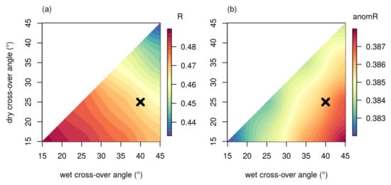 Average time series (a) R and (b) anomR between observed WTD and backscatter estimates using various combinations of dry and wet cross-over angles. The metrics are averaged across all sites, ascending and descending node. The cross symbol indicates the commonly applied cross-over angles θd = 25° and θw = 40° at which R = 0.47 and anomR = 0.39 (see Table 1).