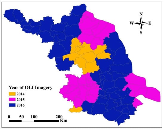 In addition to carrying out the comparison between four classification methods among the case counties, we would then use OCSVC to generate a distribution map of paddy rice for the entire province. High-quality satellite images which could cover the entire province were acquired for this purpose. All imagery data used in this study were from Landsat 8 Operational Land Imager (OLI). The rice growing season in Jiangsu Province often exhibits a long period of rainy days, which precludes the availability of complete time series Landsat imagery. To avoid the inadequacy of cloudless images from one year, we used images acquired in the last three consecutive years. This strategy is supported by the marginal variation in total rice cultivation area in three recent years. According to the Statistical Yearbook of Jiangsu [