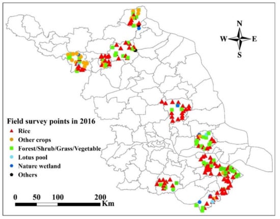 Figure 4). We designed the routes using high spatial resolution Baidu Maps and county road maps before surveys. The routes were determined according to the territories of counties that are scattered in Northern, Central, and Southern parts of Jiangsu Province. Along the survey routes, we collected random field points at sub-pixel locations. We obtained precise coordinates using GPS and took photos at corresponding sites. Photos were taken inside the fields at a distance of 30 m or more away from the field boundaries using digital cameras. To ensure the land cover types could be re-confirmed after the survey, we took at least eight photos in eight directions within each field. Some extra photos were taken from other positions nearby in order to better describe the surroundings. A total of 227 points with 2170 photos were collected during the field campaign in 2016, including points for paddy rice, other crops (corn, soybean and peanut), natural wetlands, forests, and shrubs.