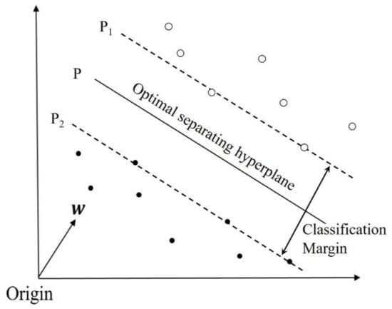 Figure 6 by taking the two-class classification as an example. The solid points and the hollow points represent two different classes of samples in a high-dimensional feature space and P is the optimal separating hyperplane. P1 and P2 are the hyperplanes generated by two classes of support vectors, both paralleling to P. The distance between P1 and P2 is called the classification margin. The optimal separating hyperplane P separates the two categories by maximizing the classification margin.