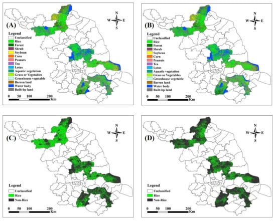 Table 4). In addition, 64,218 pixels for rice and 77,530 pixels for non-rice were prepared for the validation of county-level classification accuracy. At the province level, an additional validation dataset with evenly-distributed points across the province included 44,786 pixels for rice and 45,974 pixels for non-rice classes.