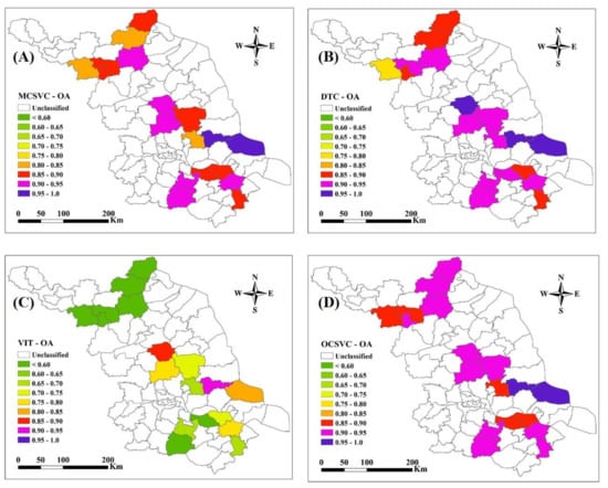 In this rice mapping study, the objective was to extract the rice planting area and leave other land cover types alone. Therefore, only training samples of rice were defined and sampled for OCSVC. For the two MCC methods, all categories were strictly defined and sampled. For MCSVC and DTC, all kinds of vegetation types were separated precisely since our target type is only one of them. For VIT, the δ was taken as 0.01 so that the NDVI values that give probability density equal to 1% and 99% were determined as the classification thresholds. The thresholds were calculated among 18 case counties, respectively. It is necessary to point out that the MCSVC shared the same multi-class training sets with the DTC. Meanwhile, the four methods evaluated in this study shared the same set of training samples of rice.