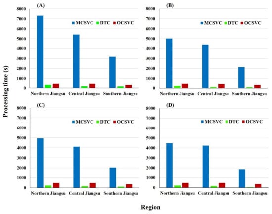 The time consumption of classification covered the establishment of the classification model and the process of image classification. Since VIT only needed time for determining thresholds, its time consumption was ignored. To exclude other variables, we designed four groups of tests to better assess the processing time of different methods. In addition, the 14 classes of training samples were reorganized into four classes, three classes, and two classes to investigate the influence of class definition on the computational time.