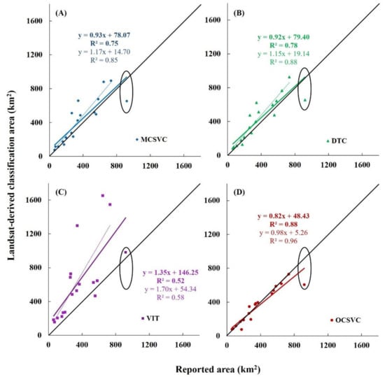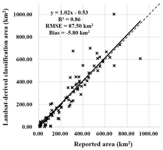 To assess the area accuracy of our rice planting area extraction method, we compared the reported rice acreage to our classified rice area. The statistical data of rice cultivation area in 2016 for all counties of the province were cited from agricultural department report [