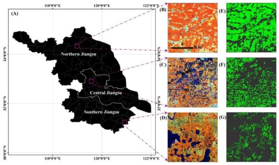 According to administrative planning and cultural characteristics, the whole province is divided into southern, central, and northern regions. The northern, central, and southern parts of Jiangsu contain different terrain, planting structure, and urbanization levels. Northern Jiangsu is characterized by the largest area of cultivated crops and the greatest diversity of crops types. Central Jiangsu is characterized by well-connected river systems and hydrological networks where rice is the most cultivated crop. Central and southern parts have more rainfall than the northern part. In addition to the rivers and lakes, high-level urbanization leads to smaller and scattered fields in the southern region. Six typical counties were selected from each of the three regions (