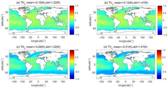 Meissner et al. indicated that the uncertainty between TB (in Kelvin) and sea surface salinity (in psu) is approximately 1:2 []. Thus, the accuracy of TB calculated models directly affects the retrieval accuracy of SSS []. Here, to better understand the influence of the dielectric constant model on the TB of a flat sea surface, Figure 1 shows the differences of L-band TBs in August 2012 calculated by Klein and Swift (KS) model (1977) [], Meissner and Wentz (MW) model (2012) [] and Yiwen Zhou et al. (GW) model (2017) [] based on the datasets in Section 2.1. The incident angle is chosen as 30° which is approximately the incident angle for the inner-most beam on the Aquarius. The mean bias (standard deviation) between the TB with GW model and TB with KS model are −0.10 K (1.22 K) at H-pol., and −0.12 K (1.47 K) at V-pol.. The mean bias (standard deviation) between the TB with GW model and TB with MW model are −0.26 K (1.22 K) at H-pol., and −0.31 K (1.47 K) at V-pol.. It is worth noting that the bias between GW and MW is higher than that between GW and KS at middle/high latitudes. The results indicate that the TB will be affected by the dielectric constant model, and further the error on the retrieved SSS will also be affected.