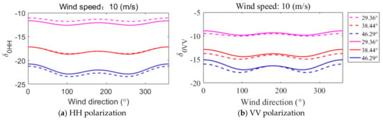 where denotes the backscatter coefficient, is a function of the WS and incident angle , and denotes the relative WD. Based on the GMF of PALSAR [] and Aquarius (Meissner et al.) [], the backscatter coefficients versus WD and 10 m/s wind speed for HH and VV polarizations are calculated in Figure 2. The incident angles are chosen as 29.36°, 39.44° and 46.29°, which are approximately the incident angles for the three beams on the Aquarius.