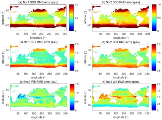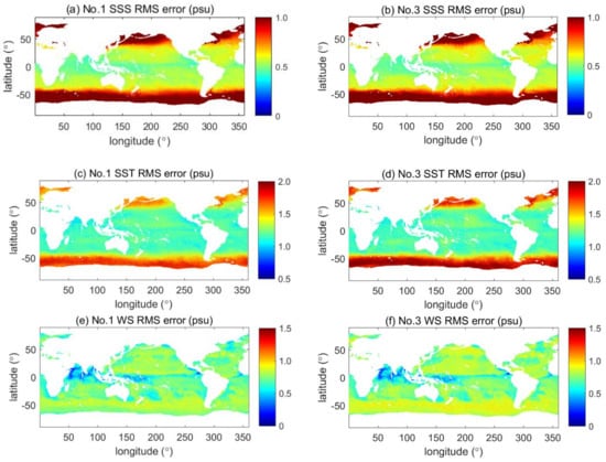 To assess whether 23.8 GHz channel is necessary to provide SSS retrieval with the required characteristics of MICAP, the SSS RMS errors during only one satellite pass with No. 1 and No. 3 configurations are shown in Figure 4a,b, respectively. It shows that the SSS RMS error is below 1 psu and varies around 0.61 psu at most of the middle/low latitudes (from 50° S to 45° N). The smallest SSS RMS error is obtained in regions of low wind speed and high temperature because the sensitivities of TB to WS at low WS and TB to SSS at high SST are greater. The SSS RMS errors increase with latitude in the Southern/ Northern Hemisphere is primarily due to the increase of WS and the decrease of SST. The greatest SSS RMS error (achieve or exceed 1 psu) is obtained at high latitudes for which the sensitivity of TB to SSS is lower at cold SST values. Compared to No. 1 configuration, the SSS RMS errors with No. 3 increase only slightly for most of the middle/low latitudes. Especially near the equator and in the Southern Hemisphere, the SSS RMS errors with No. 3 are almost consistent with No. 1, which indicates that 23.8 GHz channels (H-pol. and V-pol.) of MICAP may not bring much information in terms of SSS.