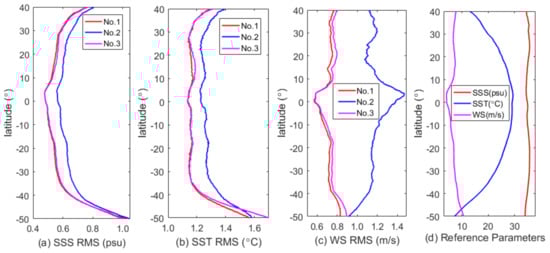 To further analyze the influence of different instrument configurations on MICAP retrieved parameters at the middle/low latitudes, the latitudinal profiles (from 50° S to 40° N) of SSS, SST, and WS RMS errors are shown in Figure 6. It clearly shows that the differences of the latitudinal profiles of SSS, SST, and WS RMS errors between No. 1 and No. 3 configurations are the smallest near the equator. From 10° N to 20° N, the differences between No. 1 and No. 3 are the greatest due to the rapidly increasing wind speed, but still less than 0.02 psu, 0.03 °C and 0.05 m/s, respectively. It indicates that there is little impact on the SSS, SST and WS RMS errors without the 23.8 GHz, which is consistent with above conclusion. Conversely, the differences between No. 1 and No. 2 configurations are the greatest near the equator (about 0.78 m/s) where the wind speed is lower than 3 m/s. The differences between No. 1 and No. 2 decrease gradually with increasing latitude in the Southern Hemisphere. From 40° S to 40° N, the differences between No. 1 and No. 2 (average about 0.08 psu, 0.1 °C and 0.45 m/s for SSS, SST and WS, respectively) are greater than those between No. 1 and No. 3 (average about 0.005 psu, 0.01 °C and 0.03 m/s for SSS, SST and WS, respectively). Moreover, the WS RMS error with No. 2 shows the obvious reverse change trend compared with No. 1 and No. 3. It further illustrates that it is necessary to correct the sea surface roughness using the scatterometer.