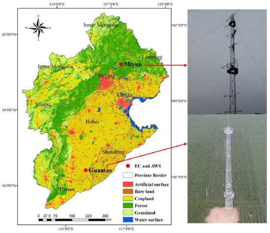 Two ground observation sites within the basin, which have typical crop types, are selected for validation. These sites are Miyun station (MY) and Guantao station (GT). The positions of the two sites are displayed in Figure 1. Site MY is in a valley of Miyun County in Beijing, which is in the north of the basin (40°37′N, 117°19′E). MY has less rainfall and lower temperatures than the basin, and it is covered by 2.5 km2 of orchard and summer maize and is surrounded by mountains. Site GT is in the North China plain (36°30′N, 115°07′E), which has a homogeneous surface and is planted with two crops (winter wheat from October to June and summer maize from June to September). At both sites, an observation system consisting of EC and an automatic weather station (AWS) was installed to monitor the flux measurements and meteorological elements.