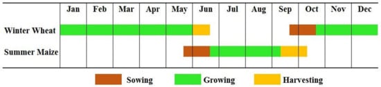 The Hai River Basin contains the largest water system in North China, which flows through eight provinces (112°–120°E, 35°–45°N) and covers approximately 320,600 km2. The basin has the semi-humid and monsoonal climate typical of mid-latitude regions. The climate is cold during the winter but recovers quickly in the spring, with a mean annual temperature range of 1.5–14 °C. The mean annual precipitation in the basin is 539 mm, and the mean annual ET is 512 mm, most of which occurs during the summer. Figure 1 shows the position and land cover map of the whole basin using multi-temporal MODIS data and an object-based classification method. The underlying surfaces of the basin are mainly mountains and plateaus in northern and western regions and plains in the southern and eastern regions. Winter wheat and summer maize are the two main crops grown on arable land and are rotated with the change of season. Figure 2 shows the phenology of the two crops.