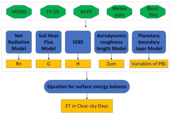 Estimation flowchart for ET on cloud-free days. The green indicates input data, the blue indicates methods, the orange indicates results.