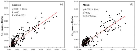 Surface conductance can be estimated as the inversion of the P-M equation with EC and meteorological measurements. Therefore, the surface conductance model described in Section 3.1 was calibrated using inverted values calculated with part of site measurements and key parameters, such as and , which were determined at sites GT and MY. The surface conductance estimations using satellite and meteorological data at both sites were compared to the inverted results using site measurements. The validation results are shown in Figure 4. The sample numbers indicate that both satellite data and EC measurements are of good quality.