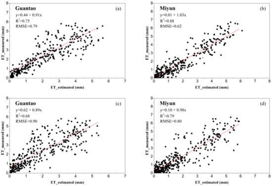 Daily ET comparisons between estimations and EC measurements. (a) Estimation with enhanced method at GT site; (b) estimation with enhanced method at MY site; (c) estimation with original method in GT site; and (d) estimation with original method at MY site. The red line is fitting line. The black boxes indicate values of ET.