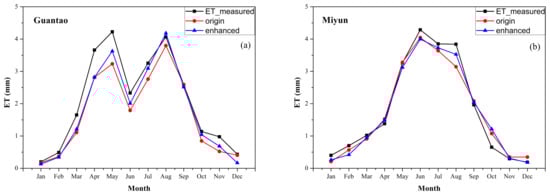 Variation in the monthly averaged ET from both methods and EC measurements at stations Guantao (a) and Miyun (b).