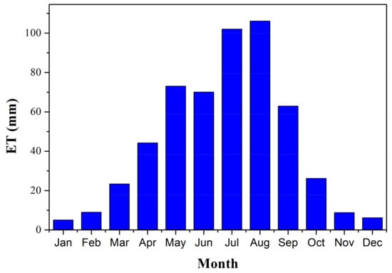 The gap-filling method proposed in this study was applied combined with P-M equation to estimate regional daily ET for Hai River Basin. As shown in Figure 7, the ET spatial patterns showed a decrease from southeast to northwest and were consistent with the precipitation pattern. The precipitation in the east and southeast regions was significantly greater than in other regions, and accordingly, the ET values were high in this area. Further analysis of the land cover map (Figure 1) revealed that crops in the southeast region consumed more water than the forest in the northwest region and urban areas. In addition, the area around Bohai Bay showed the highest ET, where the surface was moist, and the rainfall was abundant. Crop land and forest were further classified into dry farmland and paddy field and into arbour forest and shrub forest, respectively, based on Figure 1. The annual ET values for different land covers were counted and are displayed in Figure 8. Water surface was the highest, with more than 700 mm. Paddy field was slightly higher than dry farmland, due to the different crops. For the forest, arbour evaporated more than shrub, while the ET of forest was less than the cropland. Grassland and artificial surface were the lowest among these classes. The difference between ET and precipitation in the artificial surface resulted from many urban areas being covered by impervious surfaces, such as roads and buildings. In addition, Figure 9 shows the temporal variation in the monthly ET over the whole basin. The values increased gradually from January to May and decreased in June, which was influenced by the variation in meteorological elements and phenology of winter wheat. A rapid recover in July and August was shown because of the growth of summer maize.