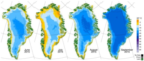 - Hall, D.K.; Comiso, J.C.; DiGirolamo, N.E.; Shuman, C.A.; Box, J.; Koenig, L.S. Variability in the surface temperature and melt extent of the Greenland ice sheet from MODIS. Geophys. Res. Lett. 2013, 40, 1–7. [Google Scholar] [CrossRef]