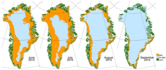 Examples of monthly surface melt maps of the Greenland Ice Sheet derived from the MOD29 special MODerate-resolution Imaging Spectroradiometer (MODIS) ice surface temperature product, for June through September 2015.