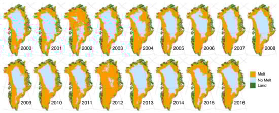 Maps of maximum annual surface melt on the Greenland Ice Sheet derived from the MOD29 MODIS monthly ice surface temperature (IST) product of Greenland (2000–2016).