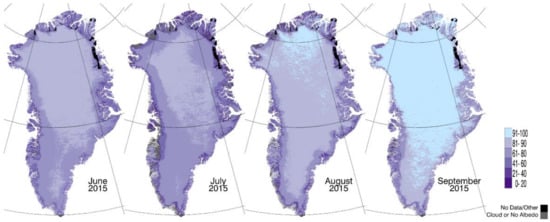 Albedo. The C6 MOD10A1 snow product provides the daily snow albedo [] that is used in the present product. A C6.1 MOD10A1 product will be produced in the near future, but it is not yet available. The MOD10A1 daily snow albedo algorithm, both developed and first validated by Klein and Stroeve [], has also been evaluated over Greenland by Stroeve et al. [] and has been used by many investigators (e.g., [,,,,]. The MOD10A1 albedo algorithm is based on a model of bidirectional reflectance of snow to correct for anisotropic scattering effects over non-forested surfaces []. In the new ESDR, daily and monthly (Figure 4) albedo maps are provided.