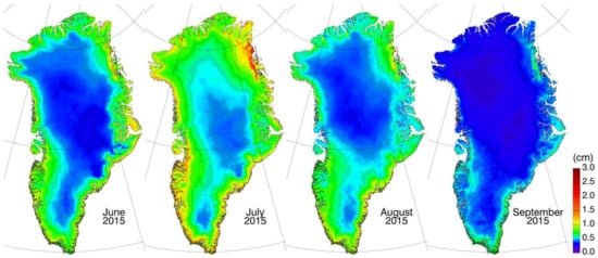 Examples of monthly water vapor maps of the Greenland Ice Sheet derived from the Collection 6 MOD05 standard MODIS product [], for June through September 2015.