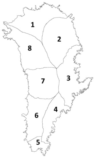 Ice Mask and Delineation of Drainage Basins. A land/water/ice mask from the Greenland Ice Mapping Project [] is provided in the ancillary data layer. There is also a separate field delineating eight major drainage basins as well as the sub-basins, developed from ICESat vector data [], as shown in Figure 6. Basin 1 has four sub-basins; Basins 3 and 4 have three; Basins 2, 6, 7, and 8 have two; and Basin 5 has no sub-basins.