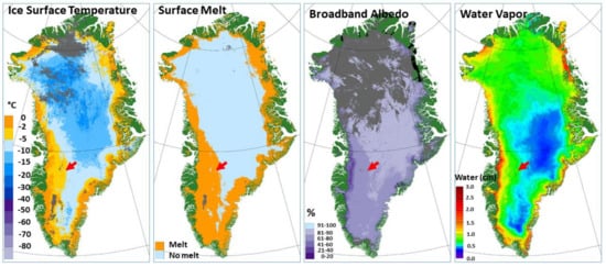 Four-day composites from 10–13 July 2014 of the daily ice surface temperature (IST), surface melt, albedo, and water vapor (WV) maps. Coastal land outside of the ice sheet is dark green and cloud is grey; missing data is black. The red arrow points to the same place on each map. Cloud cover is different on the IST, melt, and albedo maps because of the way the algorithms perform the compositing even though the maps are derived from the same four-day period.