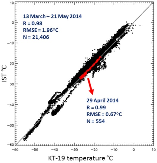 Comparison of ice surface temperature (IST) and KT-19 infrared-radiometer-derived temperature acquired during IceBridge flights over Greenland between 13 March and 21 May 2014. The points shown in red are derived from a flight segment on 29 April which was a day with minimal cloud cover (though was not completely cloud-free).