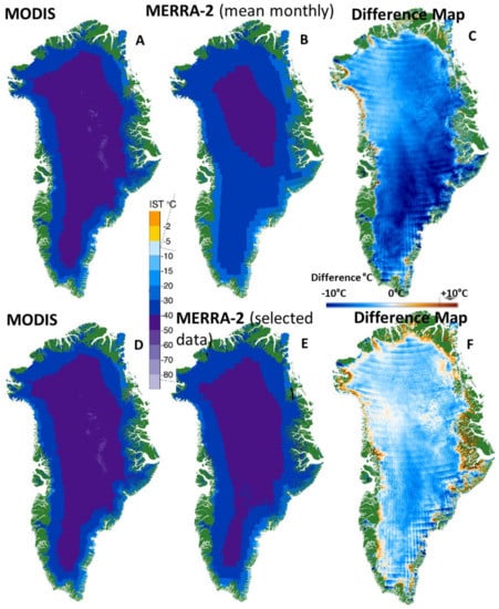 January 2015 monthly maps. Top row: Monthly average of all available data. (A): MODIS ice surface temperature (IST) swath; (B): Modern Era Retrospective analysis for Research and Applications, Version 2 (MERRA-2) skin temperature; (C): MODIS minus MERRA-2 difference map, in °C, for January 2015. Bottom row: (D): Monthly average of all available MODIS IST swath data as in (A); (E): MERRA-2 skin temperatures averaged over times corresponding to available MODIS IST swaths used to create (A,D); and (F): difference map, in °C, of MODIS minus MERRA-2, for January 2015.