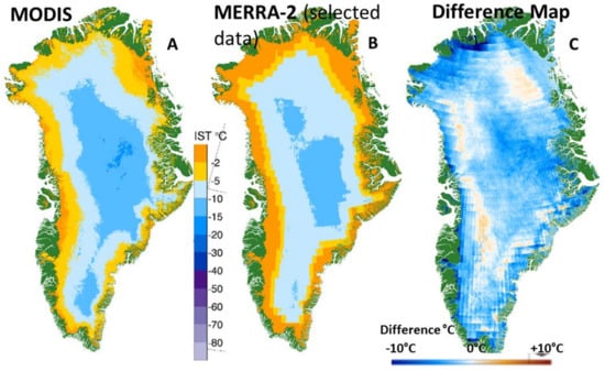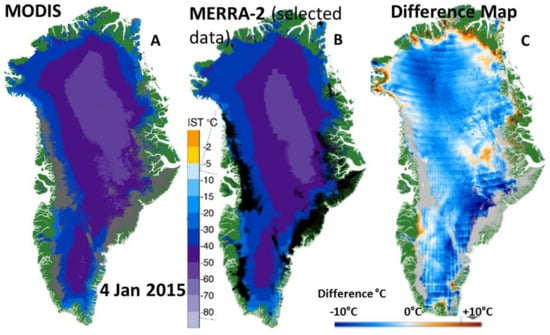 4 January 2015 skin temperature maps. (A): MODIS daily ice surface temperature (IST); (B): MERRA-2 skin temperature averaged from times selected to correspond to available MODIS IST swaths used to develop (A); and (C): a difference map, in °C, of MODIS minus MERRA-2, for 4 January 2015. Note in (B) that black on the MERRA-2 map shows where clouds are found in the MODIS map.