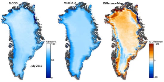 For 1 July 2015, the MODIS daily albedo and MERRA-2 albedo are shown along with a difference map for that day, in Figure 16. To calculate the MERRA-2 albedo, we averaged all of the data for the 24 h period, provided in the MERRA-2 dataset, to compare with the daily MODIS albedo map from the ESDR. The correlation between the MODIS daily albedo and the MERRA-2 daily albedo was R = 0.65. Only ice sheet cells that were cloud-free on MODIS were used to create the maps, where N = 1,978,312.