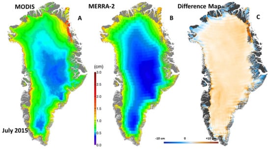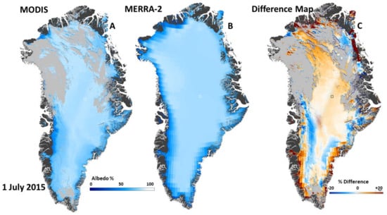 Although we cannot validate the MODIS albedo and WV layers of the multilayer product using in situ data, we can perform comparisons with modeled data such as from Modern Era Retrospective analysis for Research and Applications, Version 2 (MERRA-2). Such comparisons using other satellite data have already been undertaken []. MERRA-2 is the latest atmospheric reanalysis of the modern satellite era produced by NASA’s Global Modeling and Assimilation Office [https://gmao.gsfc.nasa.gov/reanalysis/MERRA–2/], including a representation of ice sheets over Greenland and Antarctica. The inherent spatial resolution is 1/2° latitude × 5/8° longitude [].