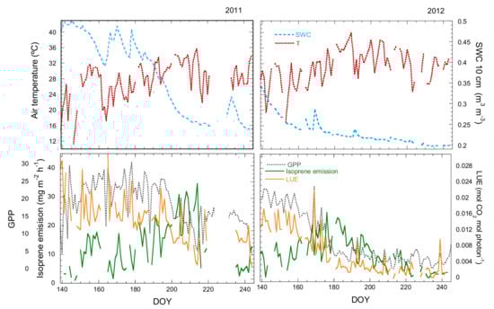 Seasonal variation of air temperature (T), SWC, GPP, isoprene emissions and LUE at the MOFLUX site in 2011 and 2012.