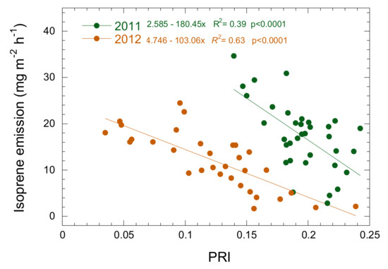 PRI was significantly and negatively correlated with isoprene emissions during the increasing phase (Figure 5). PRI explained 39 and 63% of the variance in isoprene emissions in 2011 and 2012, respectively. The slope of the relationship was similar (ANCOVA, p > 0.1) for both years but the intercept differed, with lower emission for the same PRI values in 2012.