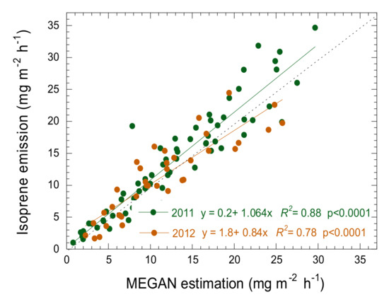 Relationship between isoprene emission and the results of the isoprene emissions estimated by the MEGAN model for the MOFLUX site during the increasing phase for 2011 and 2012. The dotted line is the 1:1 line.