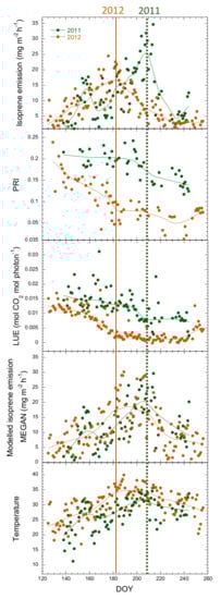 The seasonal PRI inflection point in the decreasing phase coincided with the emission peaks in both 2011 and 2012 and was thus sensitive to the advance of the emission peak in 2012. The MEGAN estimates and temperature coincided with the emission peak in 2011 but not 2012, when the measured peak was earlier (Figure 7).