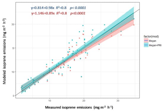 Measured versus estimated isoprenoid emissions using the MEGAN model and MEGAN model+PRI with data from the increasing phase. The black line is the 1:1 line, and the shading represents the 95% confidence intervals.