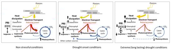 Schematics of the processes involved in the proposed conceptual model. The yellow arrows indicate the two pathways of energy absorbed by the photosystem involved in the model, electron transport and heat dissipation. The red arrows indicate the flux of reducing power. The blue arrows indicate the flux of carbon. Changes in flux intensities in situations are symbolically represented by changes in arrow width. Upward (downward) arrows indicate increases (decreases). The double pointed arrow indicates correlation between isoprene and PRI (CCI). These schematics are illustrative only and the arrows are not fitted to scale. The scheme does not include the effect of temperature that is one of the main drivers of isoprene emissions.