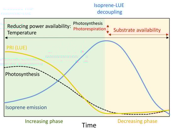 In summary, we hypothesize that seasonal isoprene emissions would be primarily driven by temperature but modulated by reducing power and substrate availability, based on observations and previous conceptual models [13,59]. Photosynthesis, photorespiration and the MEP pathway directly depend on reducing power and substrate availability. The availability of reducing power and substrate for the MEP pathway is thus dependent on photosynthesis and photorespiration. Isoprene emission would thus be stimulated by an increase in available reducing power when drought conditions decrease photosynthesis but would begin to decrease later in the season, despite the high availability of reducing power, because temperature would begin to decrease and substrate would become limiting. Photorespiration increases under drought conditions, causing a decrease in isoprene emissions, and photosynthesis (GPP) becomes minimal under severe drought, so the carbon supply for the MEP pathway is exhausted earlier, advancing the seasonal decrease in isoprene emissions. We summarize the feedbacks involved in the proposed conceptual model in Figure 9. Accordingly, we also propose a model of the performance of PRI and isoprene emissions throughout the season including the final decoupling between them (Figure 10). PRI is highly correlated with isoprene emissions at the beginning of the season and can thus be used to estimate them. Emissions and LUE become decoupled at the end of the season, when LUE (GPP) is lowest and stabilizes; LUE remains low and isoprene emissions begin to decrease.