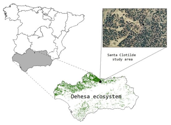 Dehesas, as evergreen oak savannas are known over Spain, are highly valuable agro-forestry ecosystems, widely distributed over Mediterranean-type climate areas (e.g., Portugal, Greece, California and South Africa). They cover about 2.5 million hectares in Spain—80% of this surface in Andalusia and Extremadura regions [1]—and play a key role in the rural development of the region, basing their productivity on a sustainable use of multiple resources (crops, livestock, wildlife and natural services). Although these areas are used to highly variable climate conditions, and summer dry periods, an increase in drought intensity and frequency and changes in agricultural practices have caused this ecosystem degradation [2]. Since dehesa is strongly dependent on human activities, private and public management, and environmental policies, are essential on its conservation. However, to assess how climate change and anthropogenic activities are modifying the ecosystem functioning and resilience, we need to understand the land–atmosphere processes that affect the system ecohydrology. Modeling and monitoring water use, evapotranspiration (ET), and water stress, ratio of actual to potential ET, at large scales is considered key in assessing changes in dehesa ecosystem functioning, and it is possible through the integration of Earth Observation data into process-based models.