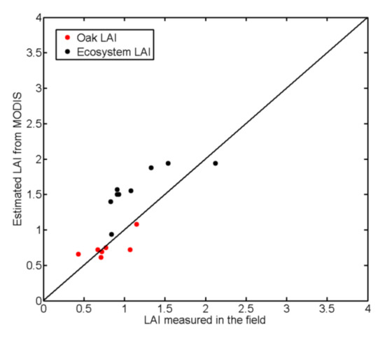 To isolate the effect of the tree layer from the understory component and to study its variability during the year, the local LAI of the trees was derived from MODIS data for both locations, taking into account that the LAI index derived integrates the clumping effect. This was done for the period when the herbaceous layer was dry, assuming that the reflectance registered by the sensor corresponded only to the oaks. The estimated oak LAI results from Santa Clotilde were compared with field measurements of LAI to study the accuracy of the estimation. Local leaf area index measurements were made over the field using a linear Ceptometer AccuPAR (model LP-80, Decagon Devices) following the distribution of the ecosystem, integrating the relatively constant oak LAI along with the herbaceous layer LAI, with high seasonal variation. Only measurements on clear days, without cloud coverage and at nadir solar position (about 12 h GTM) were made. Seven days were analyzed following this procedure (21 June 2013, 23 July 2013 and 23 August 2013, 4 June 2014, 17 June 2014, 30 June 2014 and 17 July 2014). During the period with an active grass layer, with local LAI field measurements of both oaks and grass, an “average ecosystem LAI” weighted by the surface occupied by each component was derived and then compared with the MODIS-estimated index. Dates available for the analysis were 15 May 2013, 21 May 2013, 8 April 2013, 20 September 2013, 17 October 2013, 31 October 2013, 14 November 2013, 25 April 2014, and 19 May 2014.