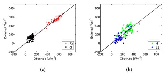 Energy fluxes estimations at higher spatial resolution better capture the heterogeneity of the area, required for rangeland planning at local scale, such us cattle density, water reservoirs and vulnerable areas management. It also allows for the validation with field ground data. To compare the turbulent fluxes results with the measurements it is necessary to weight the pixels that contribute to the ECT measurements. In this case, the footprint analysis was made following the procedure described by Timmermans et al., [37]. On 80% of the days analyzed using Landsat images, the wind direction corresponded to the predominant one (southwest, SW). A high wind speed also means a larger footprint, and this needs to be incorporated in the validation. After studying the homogeneity of the area when no predominant wind direction was observed, we selected the days where a comparison with the ECT measurements was possible. Results showed a RMSD of 64 Wm−2 for LE (38% absolute difference), 51 Wm−2 for H (26% absolute difference), and 44 (7%) and 40 (36%) Wm−2 for Rn and G respectively, somewhat higher than the errors found for the MODIS application but still within a similar range. Absolute discrepancies applying the model with the radiometric temperature derived from the four-way radiometer over the same areas [3] showed slightly higher values than the distributed application, particularly for Rn and G. This result, an increase in the error while the spatial resolution is refined, might be due to the average TRAD provided by the satellite, which better integrates the heterogeneity of the source area measured by the ECT. Estimates of the G as a function of Rn reaching the soil and the time of the day may be not adequately modeled. Even when it integrates the seasonal variation of net radiation over the year, the ratio between G/Rn might not be the same during dry versus wet period [39]. Due to the deployment of the sensors measuring G in the field, being located inside two enclosures for protecting sensors from animals (sensors installed under a tree-EA1 and on the open grass-EA2), the measurements might be not representative of the surrounding areas. The partition between the net radiation reaching the soil and the vegetation, influenced by the two different layers of canopy (i.e., understory vegetation) might not be accurately estimated for this type of ecosystem.