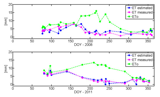 Although days with data points are linearly connected in Figure 5 to illustrate the evolution of ET values, the interpolation between dates is not likely to be linear due to sharp changes due to rainfall or other weather related conditions (cloud cover, vapor pressure, air temperature and wind). This limitation can be overcome to some extent using daily MODIS data, which can provide more frequent surface radiometric temperature data, depending on the cloud coverage. When the temporal resolution of the satellites or cloud coverage does not permit continuous monitoring, the coupling between water and energy balance models might present a good solution, using the information derived from the TSEB as a real proxy of the ecosystem water status to be incorporated in the continuous water-balance approach.