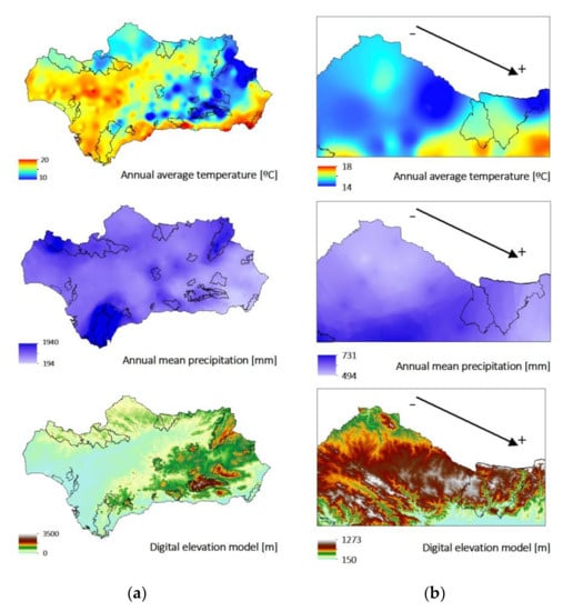 Annual mean values for temperature and precipitation for: (a) the entire Andalusian region; and (b) Zones 2 and 3.