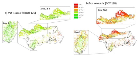 MODIS-estimated fractional cover for Andalusian dehesa for the: (a) wet season; and (b) dry season. Other land-uses different from dehesa were masked (white area).