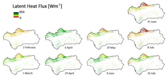 Distributed LE over Andalusian dehesa is mapped as a first approach to monitor the ecosystem status on a regular basis, with the objective of assessing the applicability of satellites together with a meteorological network, used in a remote sensing-based energy balance model (TSEB). It is shown that it is possible to derive reliable LE/ET values that reflect the local conditions and micro-climates, and the evolution of the vegetation cover over all the seasons. The gaps caused by the existence of clouds might be solved in a future by coupling these remote sensing energy balance techniques with water balance approaches, together with the use of various satellites with different spatial and temporal resolutions. The application of meteorological forcing data from a network of weather stations requires assumptions about variability in meteorological conditions, as well as a technique for extrapolation of wind and air temperature profiles to represent conditions above tall canopies. Instead, either using the Atmospheric Land Exchange Inverse (ALEXI) model, which prescribes the air temperature at nominally 50 m above the land surface [49], or using MODIS atmospheric temperature and moisture profiles (atmospheric stability product [50]) removes the need for these observations, being dependent on local conditions.