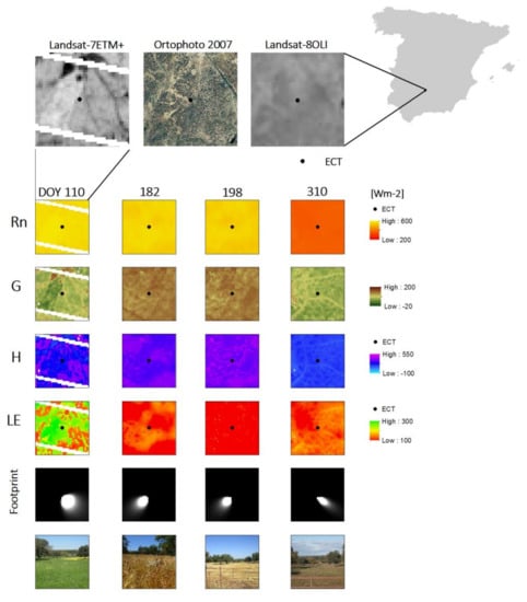 An important source of error could be due to the measurement and modeling of G. The soil heat flux directly influences the system (soil/grass understory + oak tree overstory) available energy, limiting the energy for latent and sensible heat fluxes. However, this flux is difficult to measure over the landscape, due to the heterogeneity of the experimental areas and the difficulties involved in distributing sensors across the fetch of the tower measurements, due to the extensive livestock grazing that is typical in the region. Discrepancies between observed and estimated fluxes might also be due to the sub-canopy layer existence, with a different phenology and physiology than that of the oaks. These aspects require further research, and an attempt should be done to integrate the different layers into the radiation and surface energy budgets. Discrepancies applying the model with the radiometric temperature derived from the four-way radiometer over the same areas [3], followed by the Landsat application, showed slightly higher values than the distributed application using MODIS, particularly for net radiation and soil heat flux. This improvement on the accuracy while the spatial resolution is reduced, might be due to the average TRAD provided by the satellite, which better integrates the heterogeneity of the source area measured by the ECT.